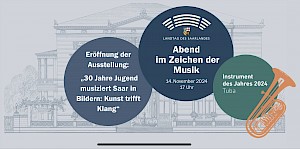 Frau Landtagspräsidentin Heike Winzent lädt im Saarländsichen Landtag zu einem Konzert zum Instrument des Jahres - die Tuba ein. Am Donnerstag, den 14.11.24 um 17.00 Uhr findet die Veranstaltung statt, die zugleich die Eröffnungsveranstaltung zur Kunstausstellung "30 Jahre Jugend musiziert in Bildern: Kunst trifft Klang" ist. Herzliche Einladung. Der Eintritt ist frei.